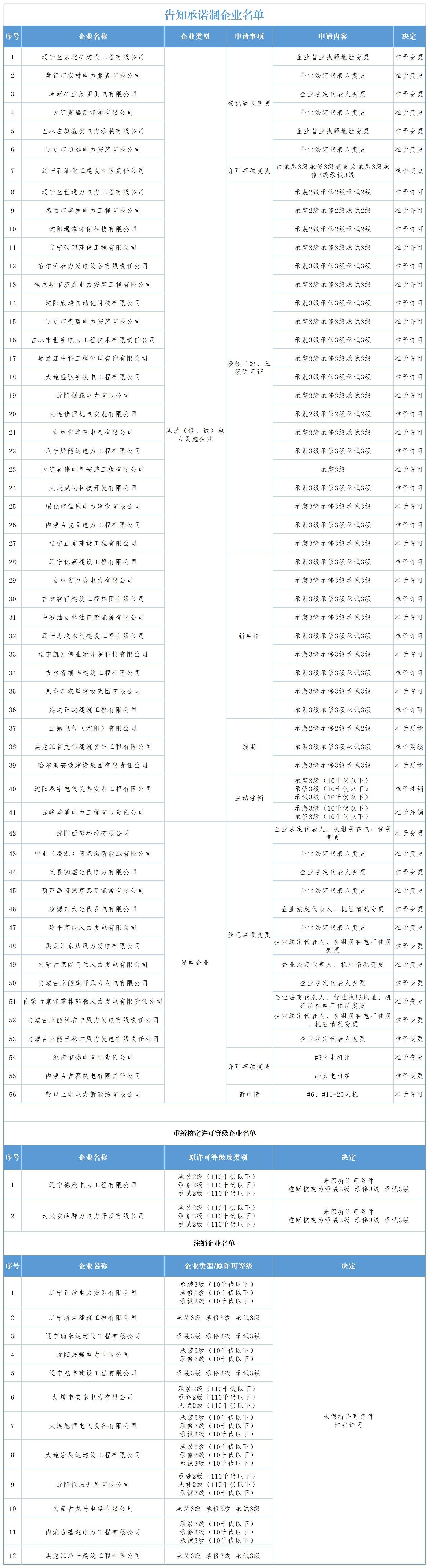 根据《电力业务许可证管理规定》《承装(修、试)电力设施许可证管理办法》和《国家能源局关于印发全面推行电力业务资质许可告知承诺制实施方案的通知》有关规定,现将2025年10月27日至11月02日审查通过的告知承诺制企业、重新核定许可等级企业、注销许可企业予以公告: