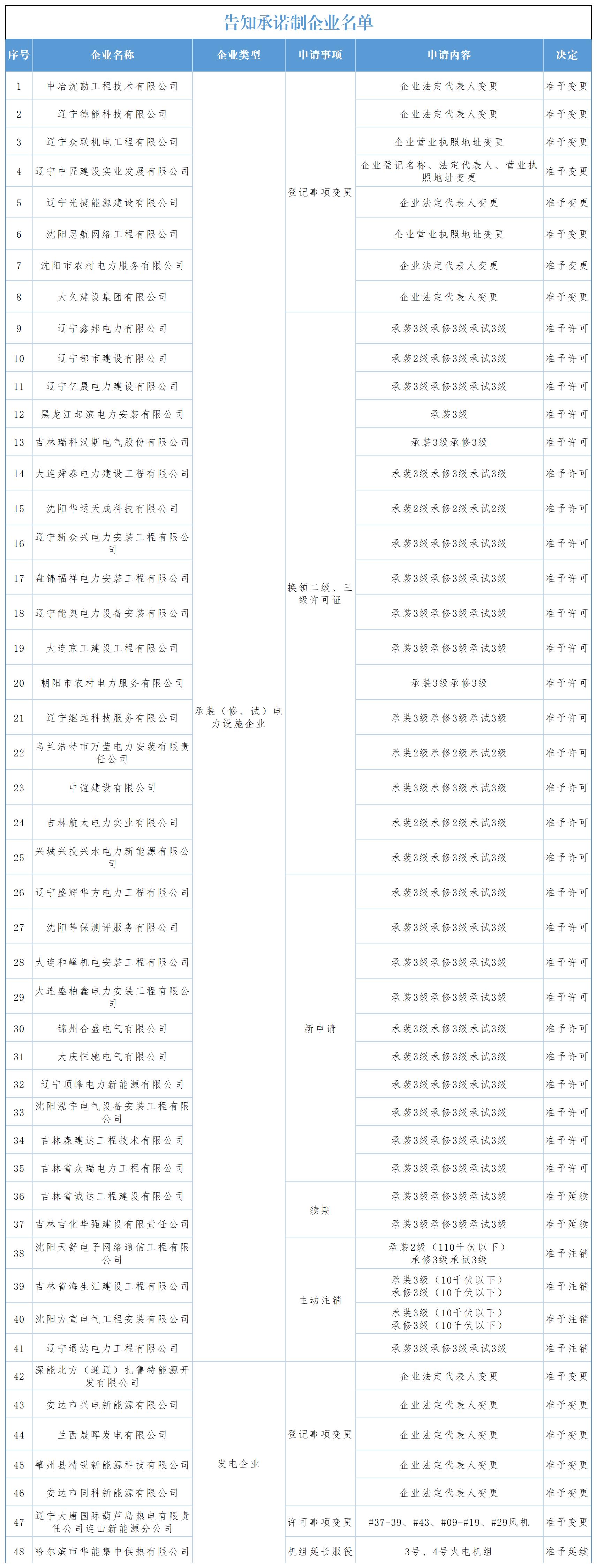 根据《电力业务许可证管理规定》《承装(修、试)电力设施许可证管理办法》和《国家能源局关于印发全面推行电力业务资质许可告知承诺制实施方案的通知》有关规定,现将2025年11月17日至11月23日审查通过的告知承诺制企业予以公告: