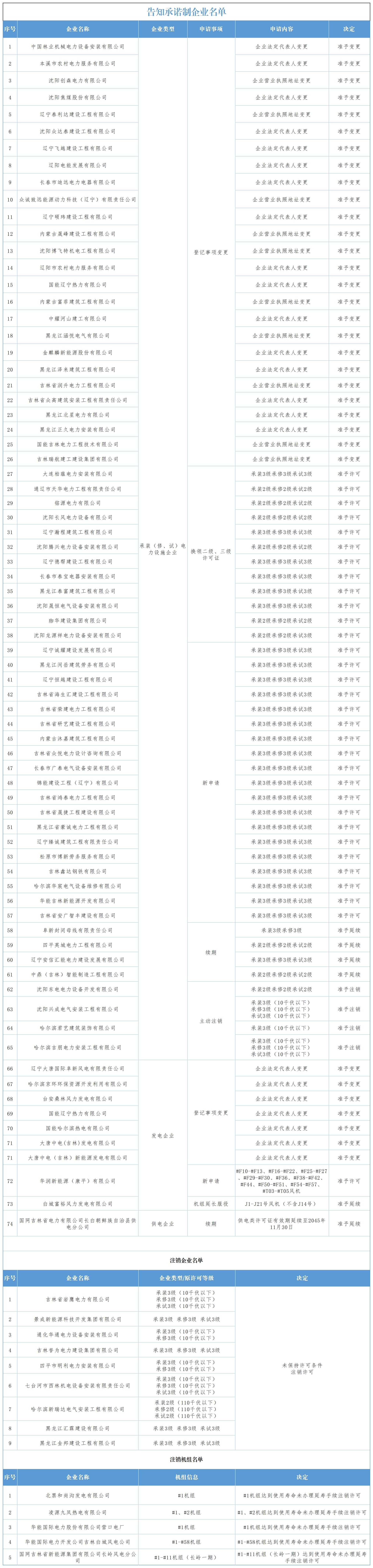 根据《电力业务许可证管理规定》《承装(修、试)电力设施许可证管理办法》和《国家能源局关于印发全面推行电力业务资质许可告知承诺制实施方案的通知》有关规定,现将2025年12月01日至12月07日审查通过的告知承诺制企业、注销许可企业予以公告: