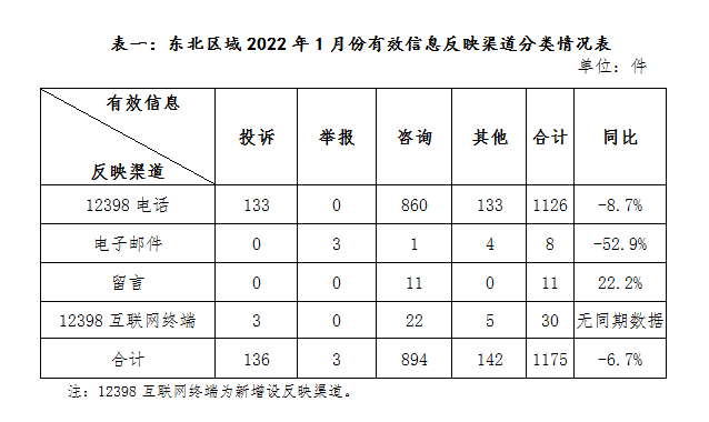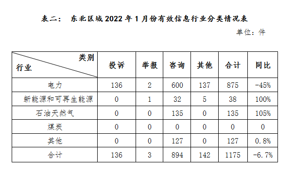 2022年1月,国家能源局12398能源监管热线(以下简称12398热线)接收东北区域有效信息1175件,同比下降6.7%,其中投诉举报信息139件。