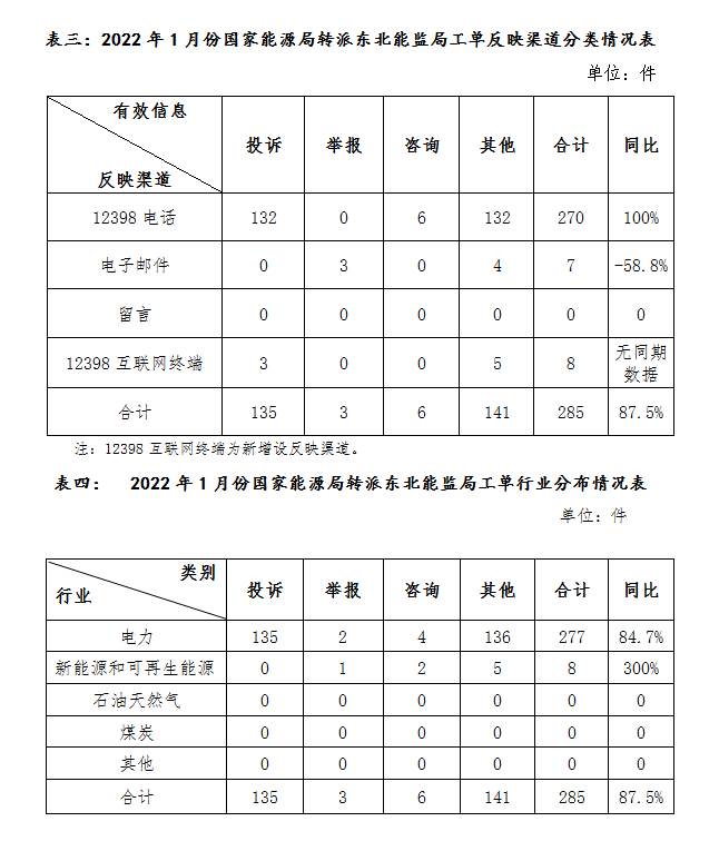 2022年1月,12398热线向东北能源监管局转派各类工单285件,同比增加87.5%。全部为电力以及新能源和可再生能源行业类工单,其中电力行业同比增长84.7%,新能源和可再生能源行业同比增长300%。(详见表三、表四)