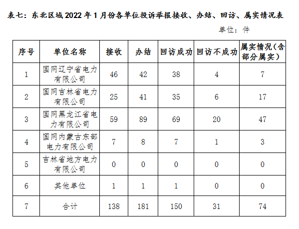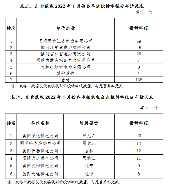2022年1月,国家能源局转派东北能源监管局138件投诉举报工单,同比增长203%。国网黑龙江省电力有限公司、国网绥化供电公司分列省市首位。(详见表五、六)