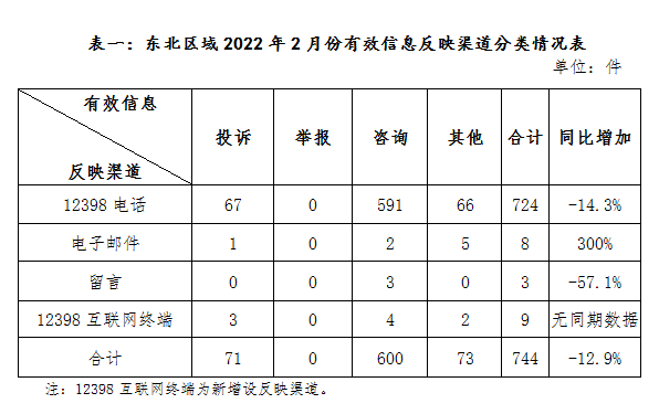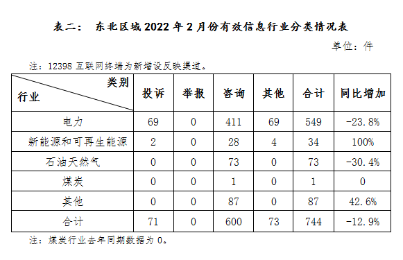 2022年2月,国家能源局12398能源监管热线(以下简称12398热线)接收东北区域有效信息744件,同比下降12.9%;其中投诉举报信息71件,同比增加103%。