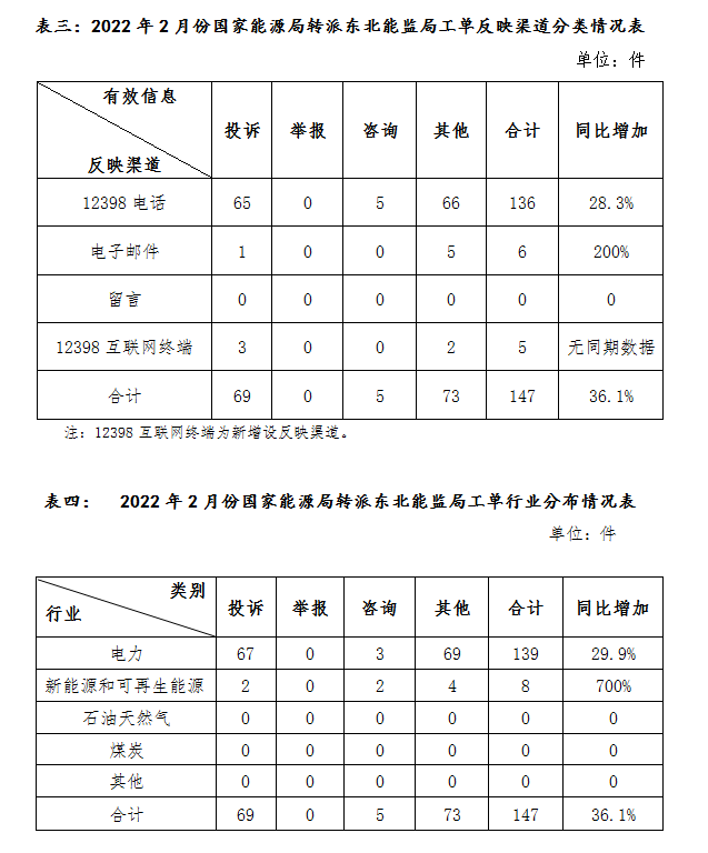 2022年2月,12398热线向东北能源监管局转派各类工单147件,同比增加36.1%,且全部为电力以及新能源和可再生能源行业类工单,其中电力行业同比增长29.9%,新能源和可再生能源行业同比增长700%。(详见表三、表四)
