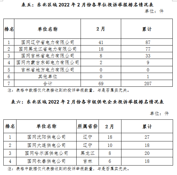 2022年2月,国家能源局转派东北能源监管局69件投诉举报工单,同比增长109%。(详见表五、六)
