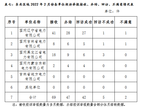2022年2月,东北能源监管局按照监管职责,受理投诉举报转派工单51件;对其他不属于能源监管职责范围的,已告知当事人。当月办结各类转派工单142件(含往月结转),其中投诉举报工单47件(含往月结转),通过回访发现,不满意工单2件,均在供电服务方面。(详见表七)