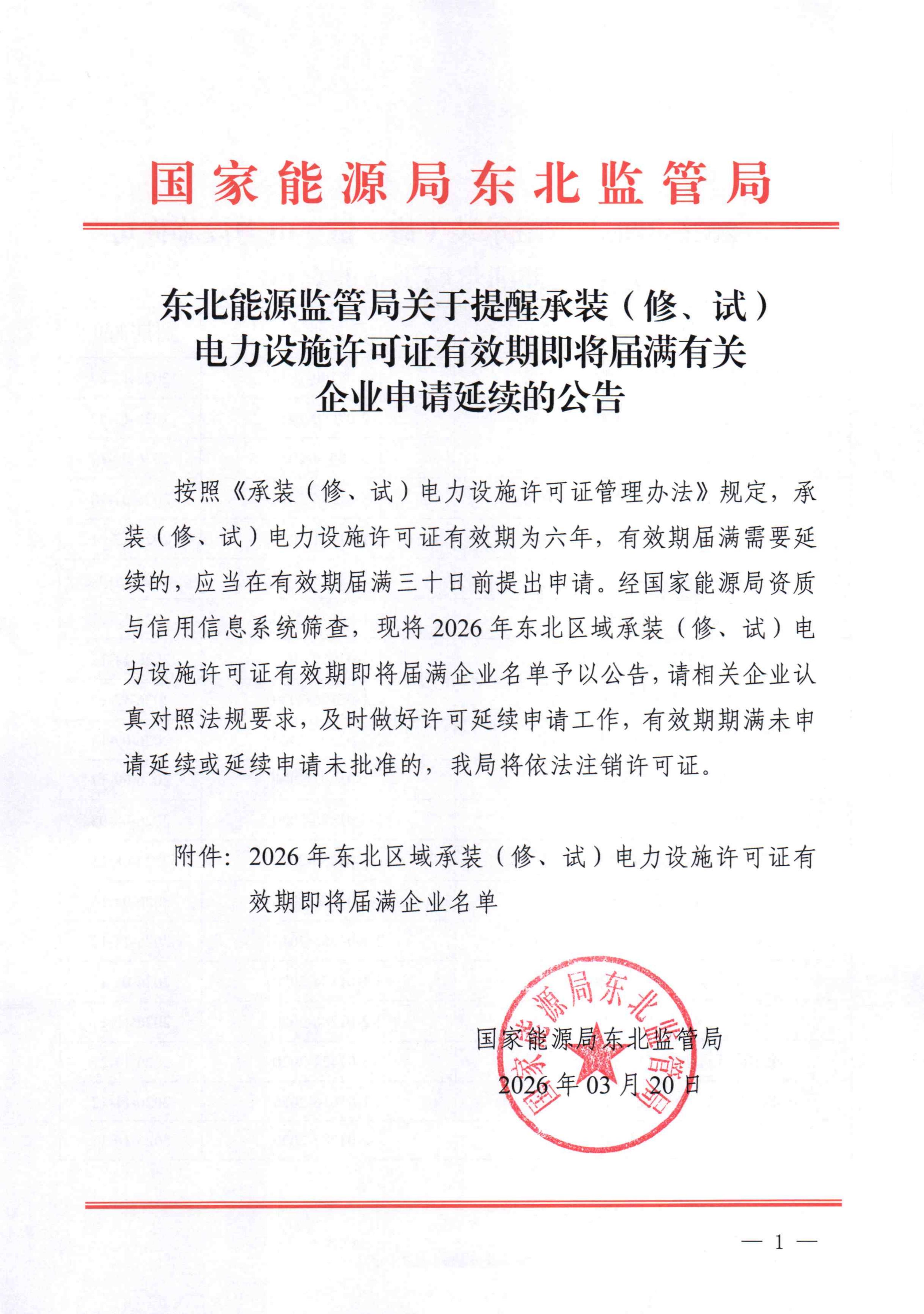 东北能源监管局关于提醒承装(修、试) 电力设施许可证有效期即将届满有关 企业申请延续的公告